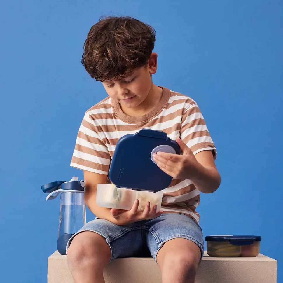 Box na občerstvenie stredný Midnight ponúka všetko, čo máte radi na veľkom boxe na občerstvenie od B.Box! Box na občerstvenie, do ktorého sa zmestí všetko. Spoločnosť b.box navrhla variabilný obedár, do ktorého si môžete zabaliť nespočetné množstvo rôznych druhov občerstvenia. Nájdete tu priehradky na ovocie, zeleninu alebo na štvrtinky toastov. Úplne jedinečný dizajn viečka krabice s elastickým krúžkom umožňuje vložiť do krabice celé jablko! Silikónové dvojité viečko potom umožňuje uložiť jogurt alebo dip (nie tekutiny) do menších priehradiek. Niektoré z vnútorných „priečok“ sú odnímateľné a nastaviteľné, takže si tento box na občerstvenie môžete usporiadať podľa svojej chuti a potrieb. Do obedára sa zmestí napríklad aj wrap, alebo banán, záleží len na vás, čo svojmu dieťaťu do tohto obedára zabalíte :-). Jednoduché otváranie umožňuje deťom samostatne sa obslúžiť.
