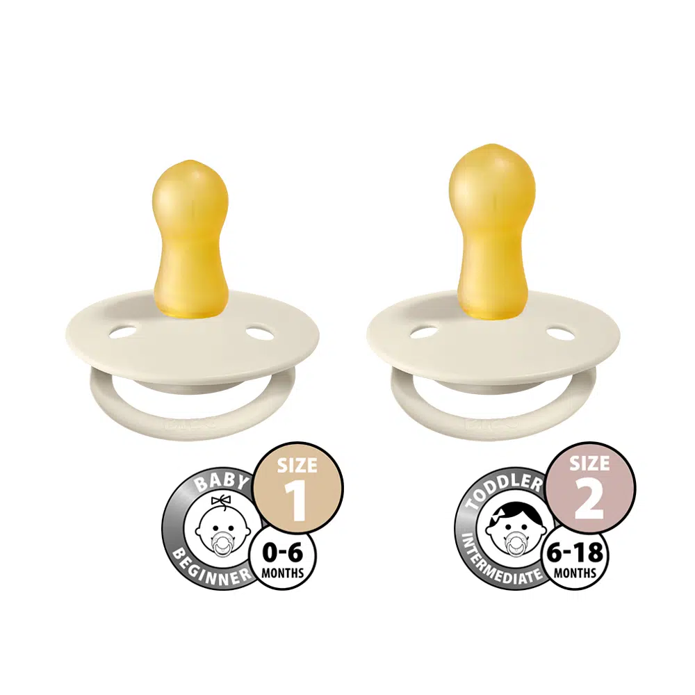 BIBS De Lux Ivory/Sage je set dvoch cumíkov z prírodného kaučuku. Sacia časť je vyrobená zo 100%-ného prírodného kaučuku, ktorý je mimoriadne pružný a mäkký zároveň, odolný proti vytvoreniu trhlín a odštiepeniu malých kúskov. Cumlík navrhli aby nedráždil citlivú pokožku bábätka. Okrúhly krúžok s vetracími otvormi má klenutý tvar, takmer vôbec sa nedotýka pokožky okolo úst, tá preto zostáva kľudná, bez otlačkov a podráždení. Vďaka mäkučkému kaučuku a zabudovanému vzduchovému ventilu dieťa cumlík ľahko stláča a formuje v ústach. Tým je zachovaný prirodzený vývin podnebia, zúbkov a ďasien detí.