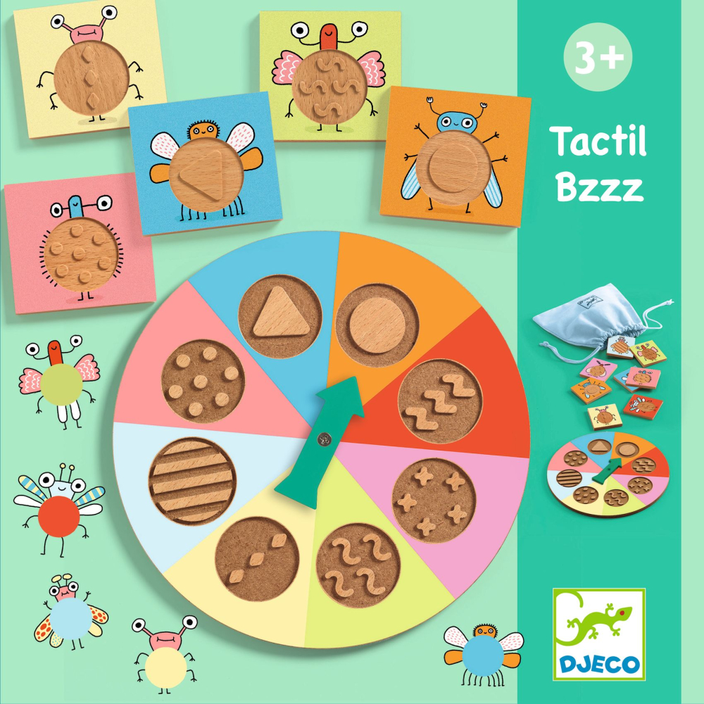 Hmatové loto Bzzz od Djeco je spoločenská stolová hra pre predškolákov. Hmatové loto s reliéfnymi drevenými doštičkami. Dieťa zatočí ruletkou a v látkovom vrecku skúsi nahmatať doštičku so vzorom, aký vytočilo ruletkou. Správne? Získa kartičku s rovnako vzorovaným hmyzom. Kto prvý získa 4 kartičky, je víťaz.
