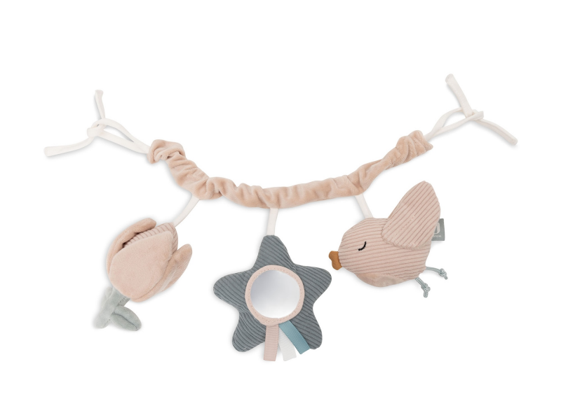 Reťaz na kočík či autosedačku Lovely Birds od Jollein so zavesenými hračkami v podobe vtáčika, tulipánu a hviezdičky s bezepčným zrkadlom zabaví vaše bábätko v kočíku či autosedačke. Mäkké hračky vyrobené z jemného plyšu hrkajú, šuštia a ponúkajú rôzne textúry na skúmanie. Hračky stimulujú koordináciu ruka/oko dieťaťa.