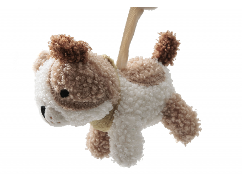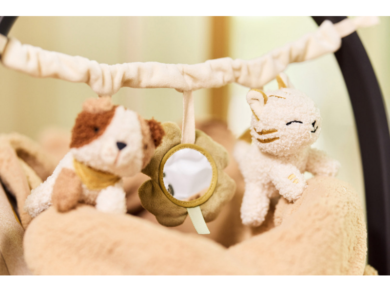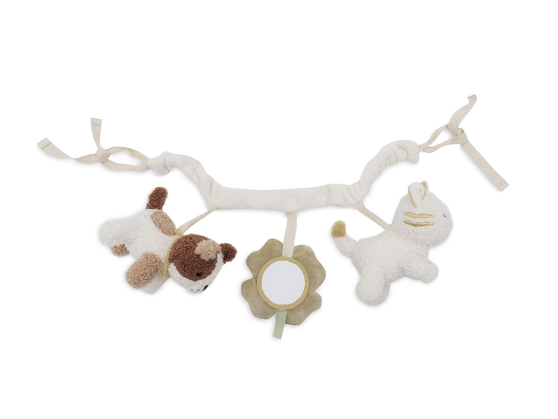 Reťaz na kočík či autosedačku Tiny Park od Jollein so zavesenými hračkami v podobe psíka, mačičky a štvorlístka s bezpečným zrkadlom zabaví vaše bábätko v kočíku či autosedačke. Mäkké hračky vyrobené z jemného plyšu hrkajú, šuštia a ponúkajú rôzne textúry na skúmanie. Hračky stimulujú koordináciu ruka/oko dieťaťa.
