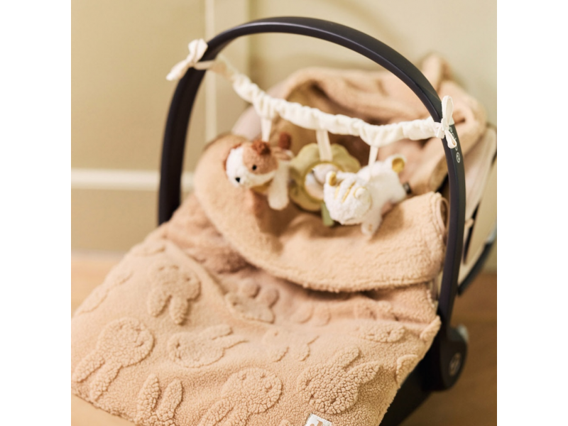 Reťaz s hračkami ľahko pripevníte ku kočíku aj autosedačke vďaka viazacím šnúrkam.