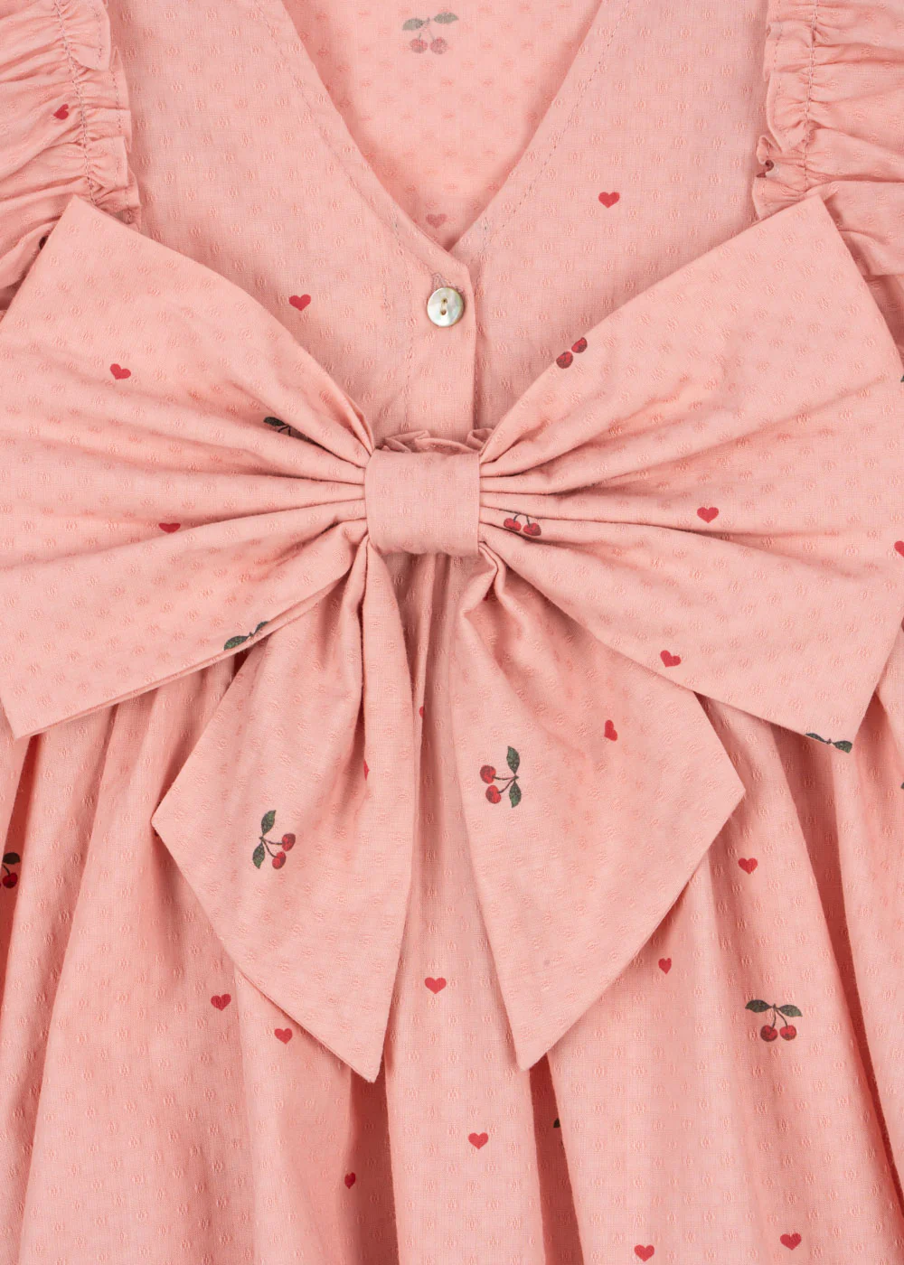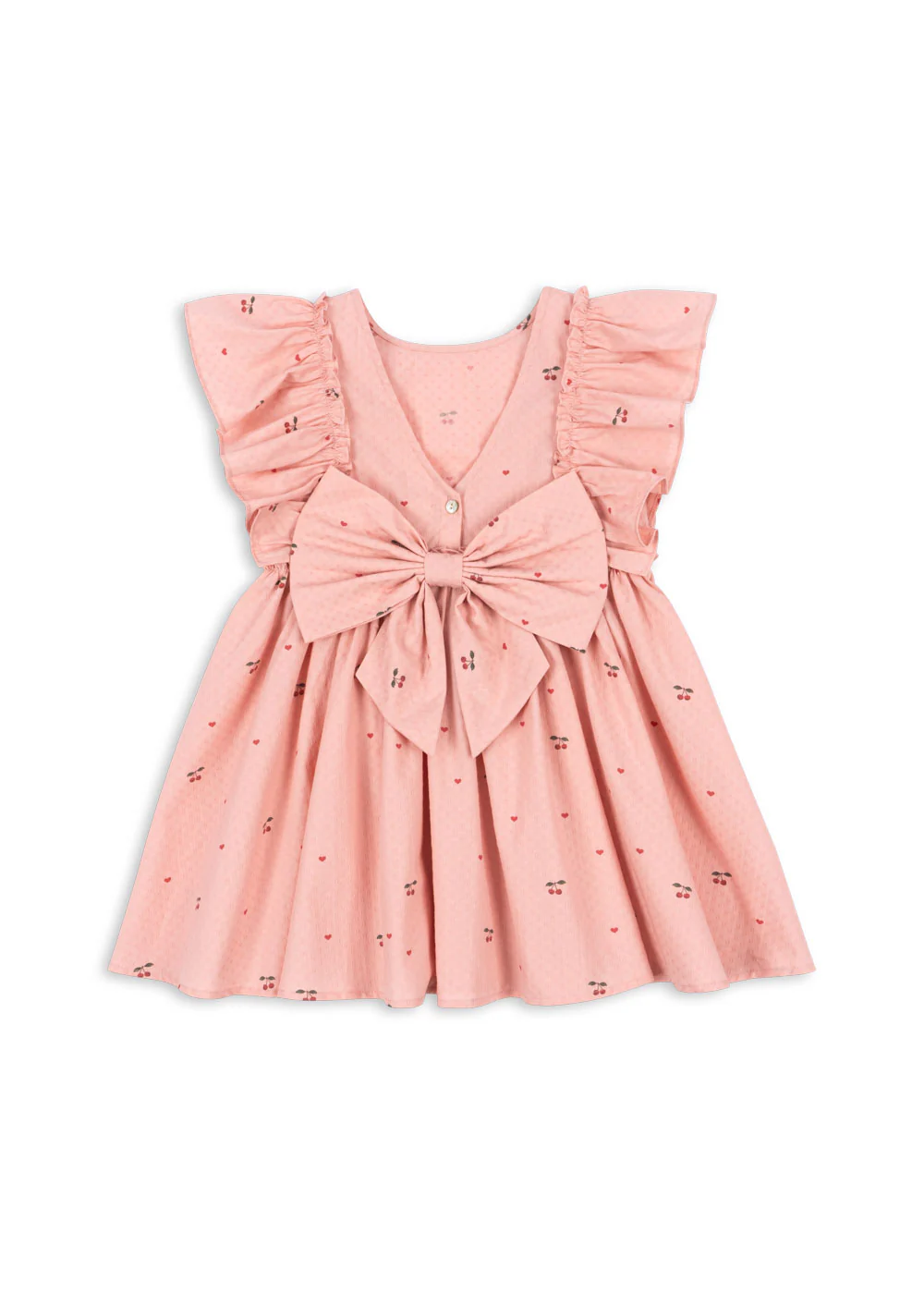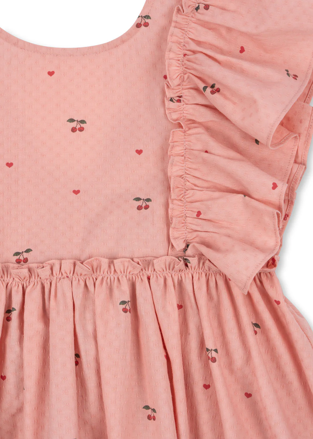 Dievčenské šaty Evia Cherry od značky Konges Sløjd zaujmú na prvý pohľad svojím nežným dizajnom s čerešňovým vzorom a krásnou mašľou na chrbte. Jemné volánové rukávy a rozšírená sukňa dodávajú šatám ľahkosť a hravý dievčenský vzhľad, ideálny na letné dni aj výnimočné chvíle.