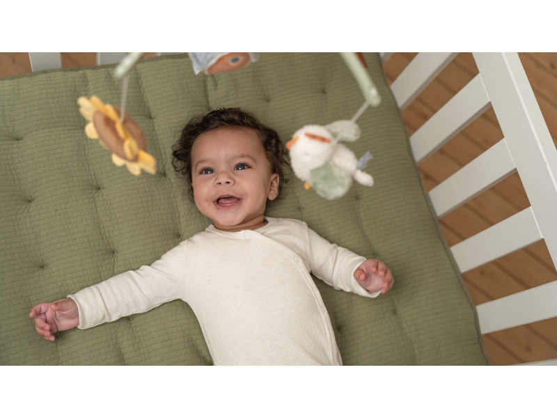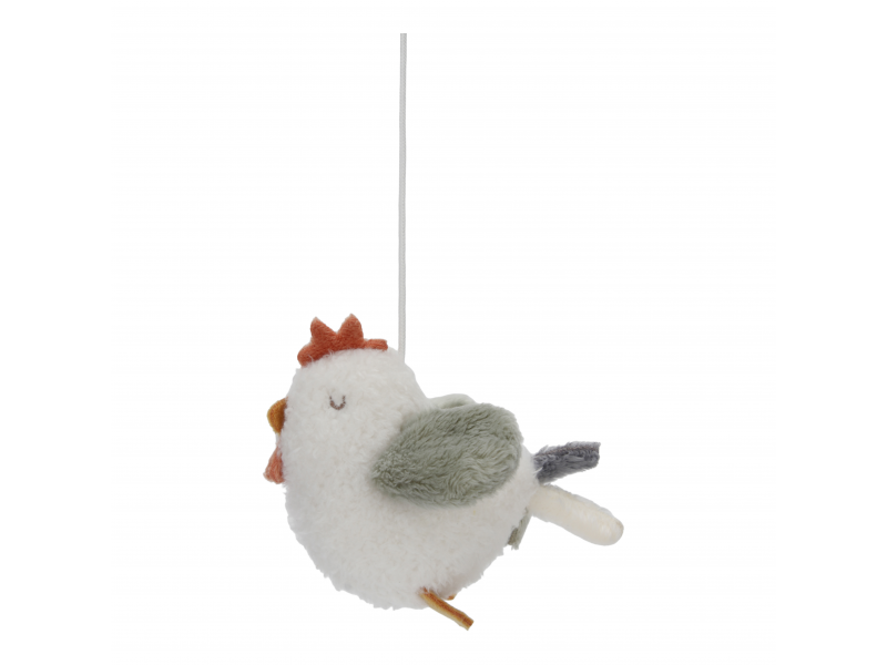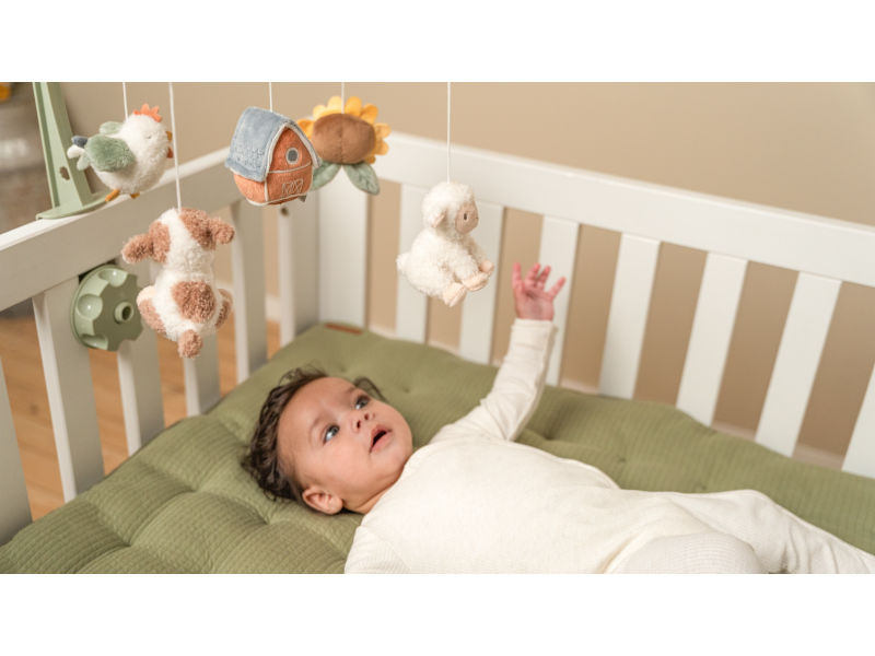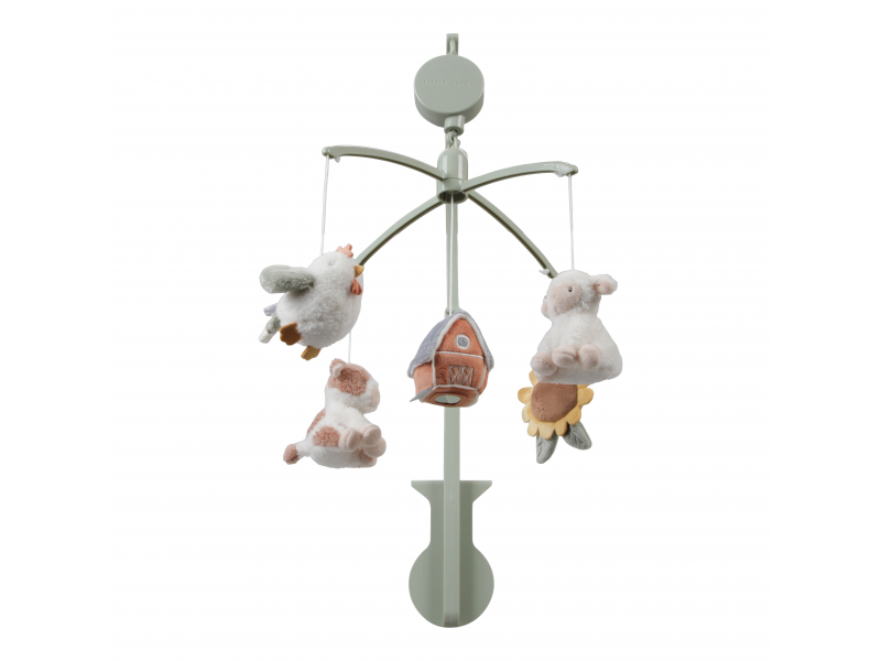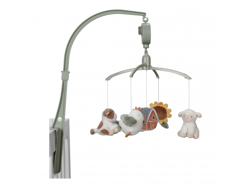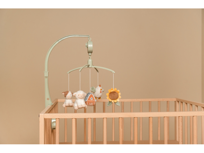 Kolotoč s naťahovacím hudobným boxom hrá nežnú uspávanku pre pokojné zaspávanie. Pozornosť dieťaťa upútajú otáčajúce sa plyšové hračky v podobe ovečky, sliepočky, kravičky, slnečnice a domček. Kolotoč ľahko pripevníte na bočnicu postieľky.