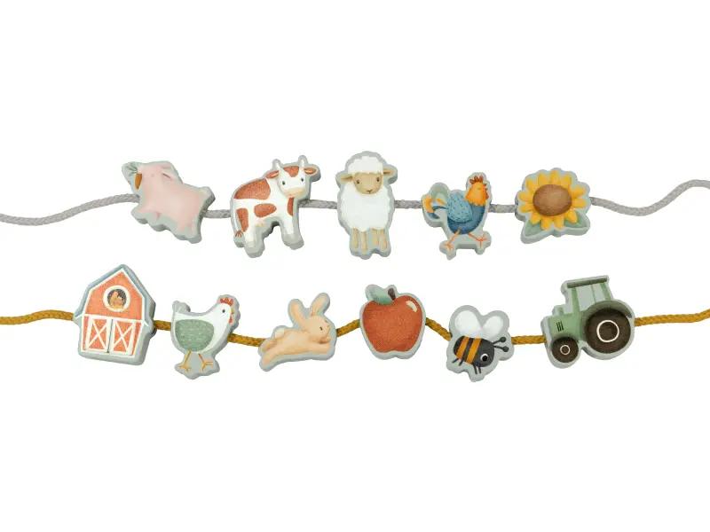 Navliekacie korále Farma od Little Dutch sú originálne drevené korálky na navliekanie tvarované a potlačené motívmi zo života na farme. Pri navliekaní zvieratiek, traktora alebo jabĺčka môže dieťa vymýšľať príbehy, ktoré zažívajú kamaráti na farme, a vytvárať nové a nové kombinácie výsledného náhrdelníka. Šnúrka v tvare šnúrky s plastovým zakončením uľahčuje navliekanie aj malým detským rúčkam.