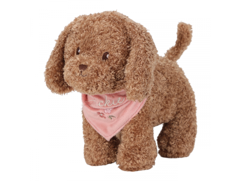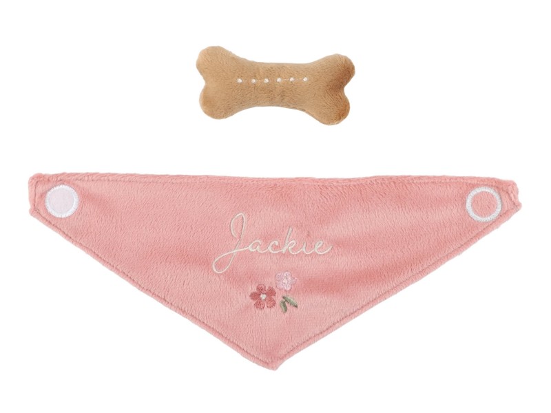Psík prichádza v elegantnej kvetovanej taške s predným otvorom, aby mohol zvedavo vykukovať von. Vďaka tomu si ho deti môžu vziať kamkoľvek – na prechádzku, na výlet, do škôlky alebo napríklad k starým rodičom. Okolo krku má uviazanú šatku so svojim menom. Plyšová kosť na hranie má vo vnútri magnet, takže drží psíkovi pri papuľke.