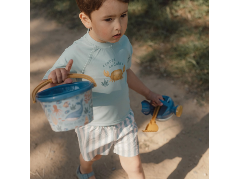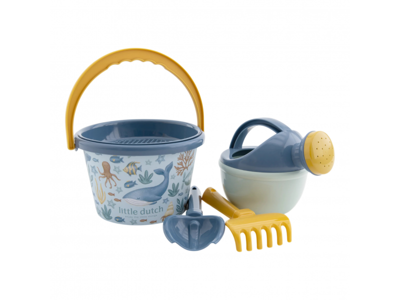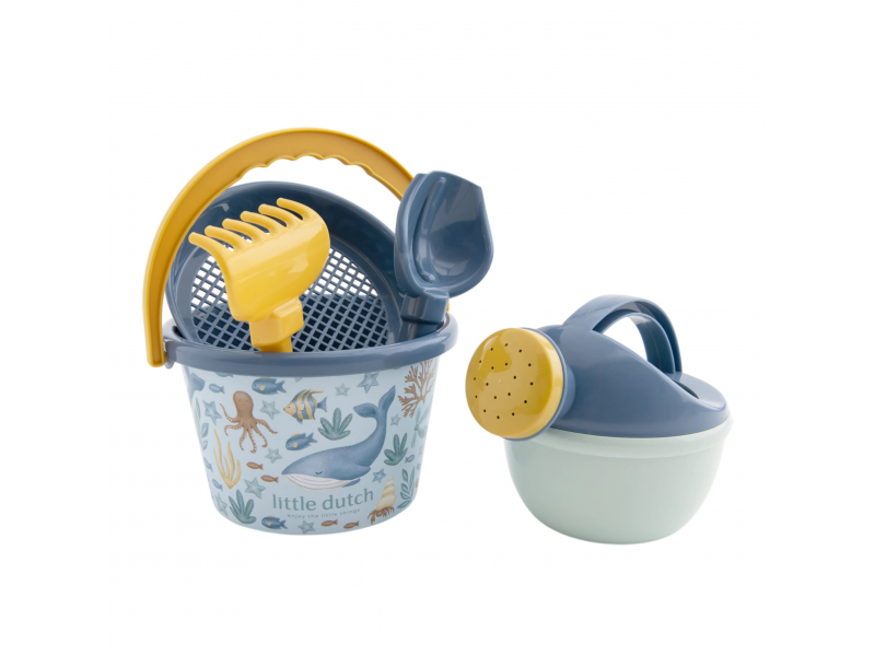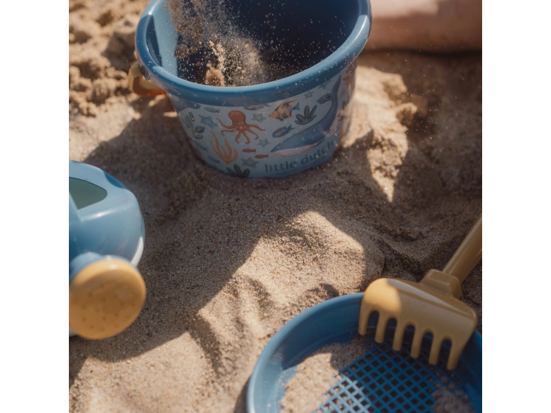 Little Dutch súprava na piesok s motívmi Ocean World sa bude deťom hodiť doma na záhrade aj pri mori na pláži. Sadu tvorí vedierko, kanvička, hrabličky, lopatka a sitko v kvalitnom prevedení z pevného plastu.