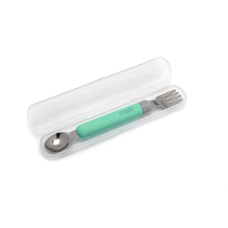 Roztomilý skladací príbor v odtieni Sivá/Mätová of kanadskej značky Melii sa postará o to, aby bolo kŕmenie bolo bez zbytočného ušpinenia. Už žiadne upatlané ručičky! Skladací príbor tvorený vidličkou a lyžičkou je v kompaktnom cestovnom púzdre. Použitý príbor môžete teda vložiť do puzdra a do tašky bez toho, aby sa obsah tašky zašpinil.