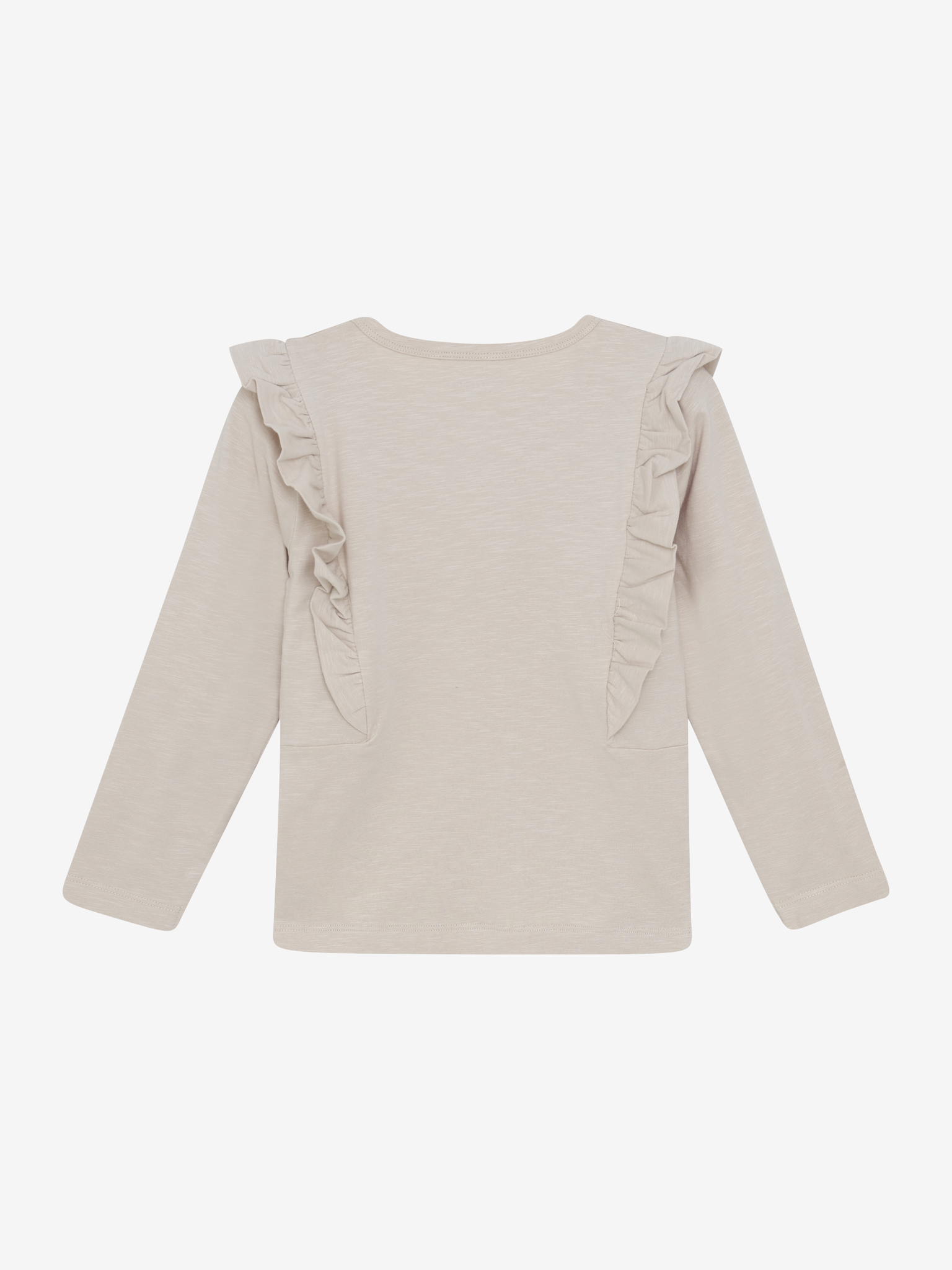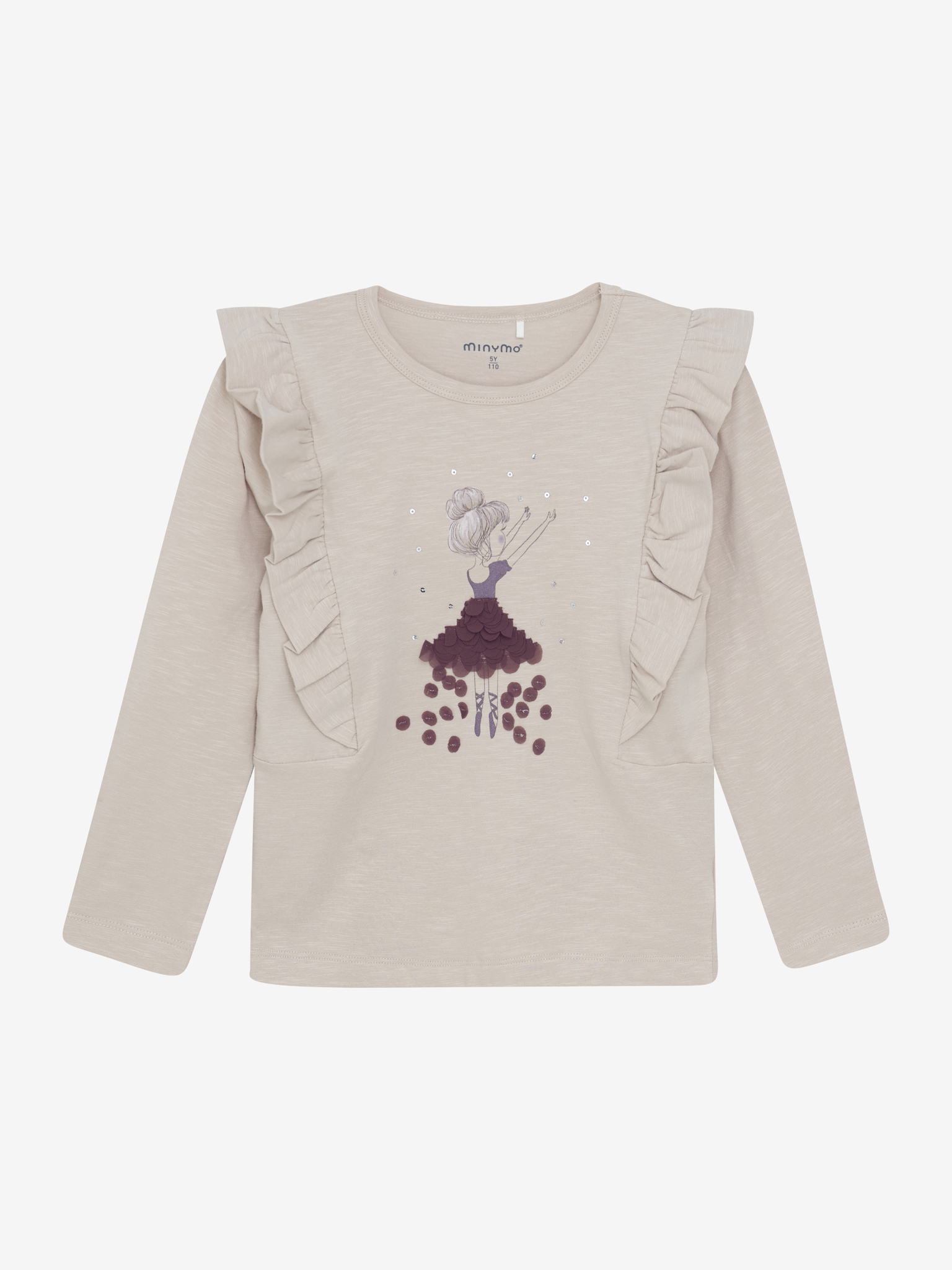 Krásne detské tričko s dlhým rukávom v dizajne Smoke Gray od škandinávskej značky Minymo. Blúzka s dlhým rukávom od značky Minymo. Blúzka má sladký a elegantný vzhľad s jemnými volánikmi pozdĺž ramien. V strede je krásna potlač baleríny s 3D efektmi a malými flitrovými detailmi. Blúzka je vyrobená zo zmesi organickej bavlny, ktorá je mäkká a príjemná na dotyk.