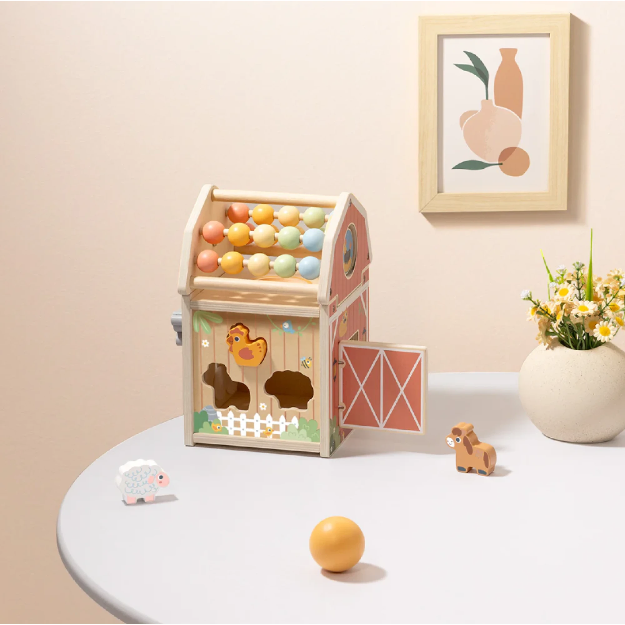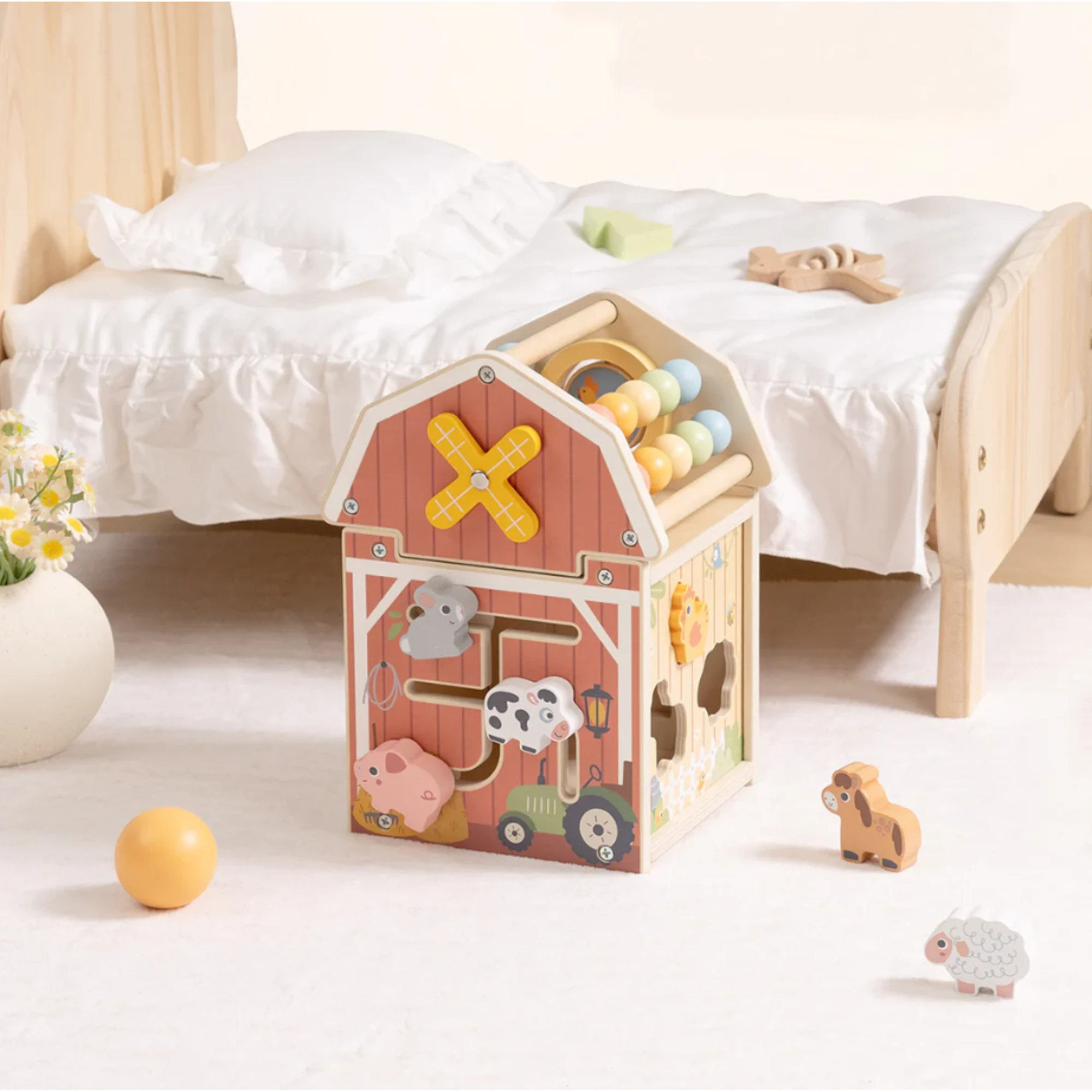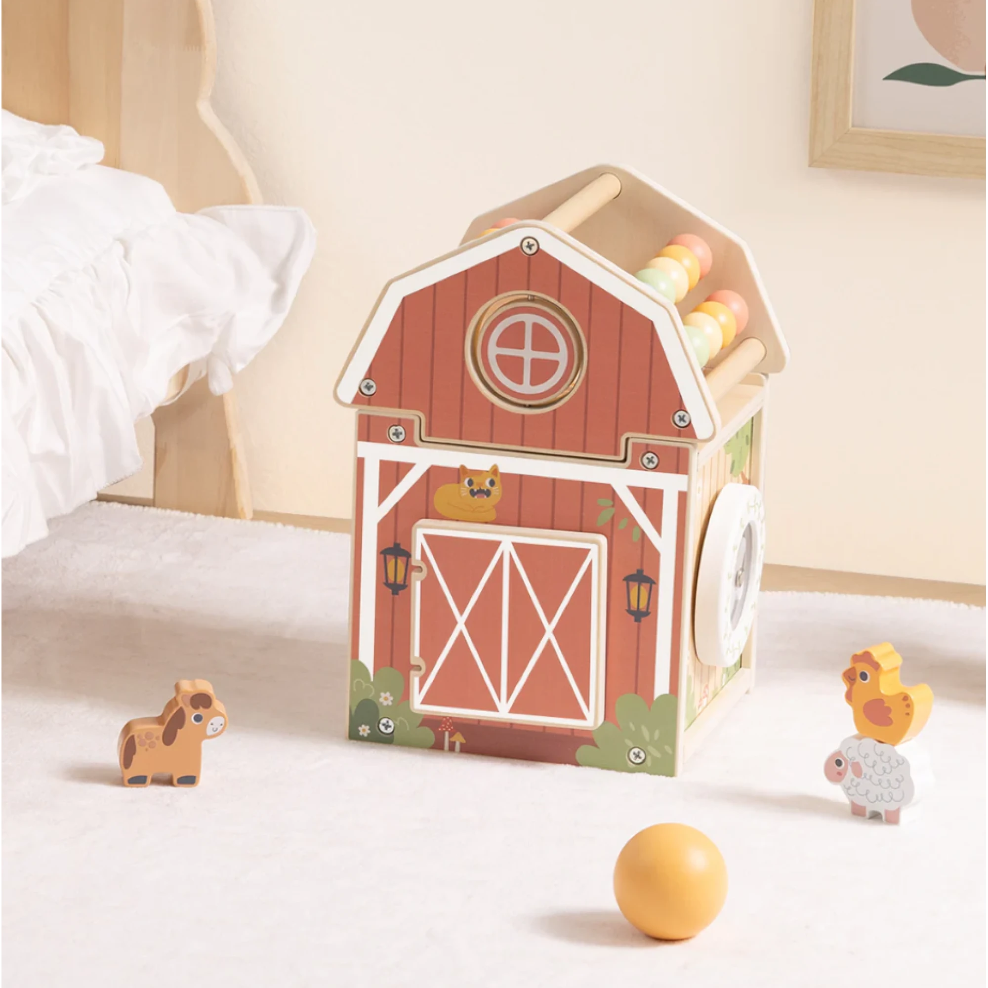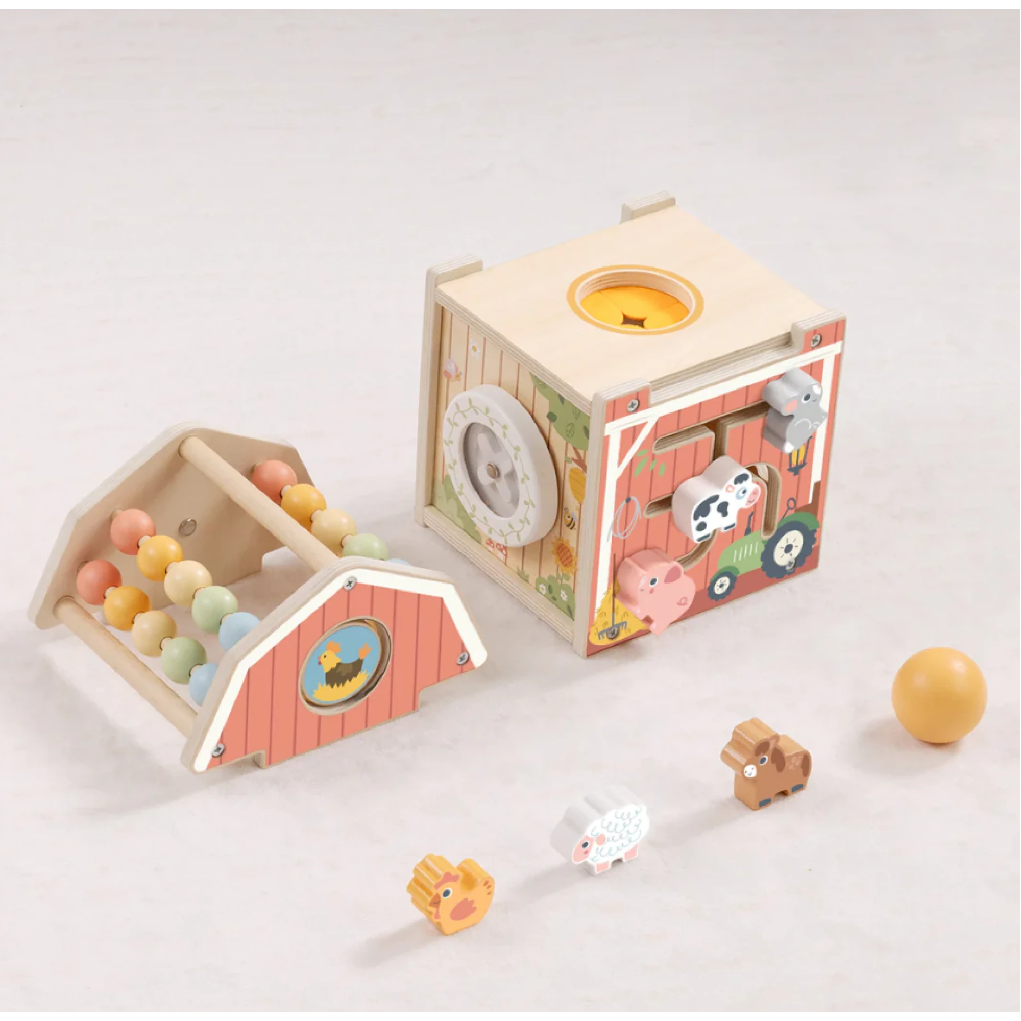 Interaktívny drevený domček v motíve Farma pre najmenších plný zábavy a učenia od Tooky Toy. Vitajte na farme, kde sa každý deň niečo deje! Drevený aktivity domček Farma od Tooky Toy ponúka malým objaviteľom nekonečné možnosti na hranie, učenie a skúmanie. Na každej strane domčeka deti objavia inú výzvu – pohyblivé zvieratká, otáčacie dieliky, farebné korálky či prevliekačku. Bezpečné, pevné a krásne spracovanie robí z tejto hračky nielen obľúbený zdroj zábavy, ale aj dekoratívny doplnok detskej izby.